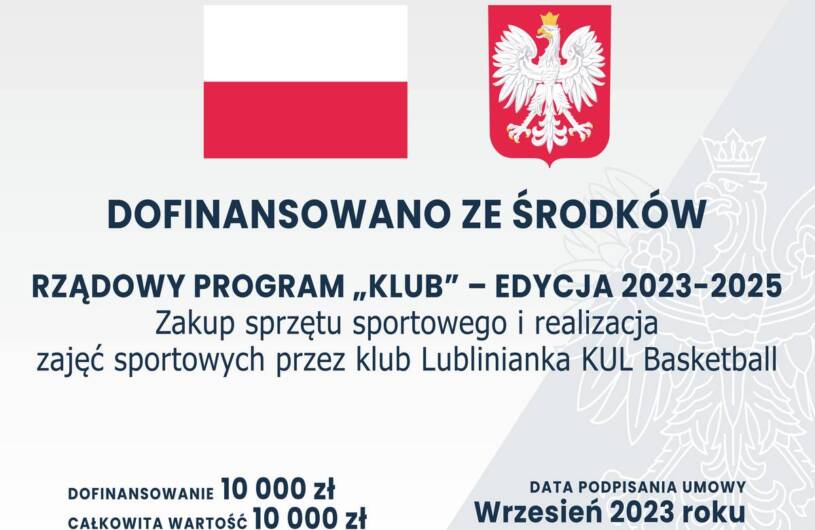 Informujemy, że realizujemy zadanie publiczne „Zakup sprzętu sportowego i realizacja zajęć sportowych przez klub Lublinianka KUL Basketball” ze środków finansowych Funduszu Rozwoju Kultury Fizycznej, polegającego na rozwijaniu sportu dzieci i młodzieży w ramach Rządowego Programu „KLUB” – edycja 2023-2025. Dysponentem Funduszu jest Skarb Państwa – Minister Sportu i Turystyki.