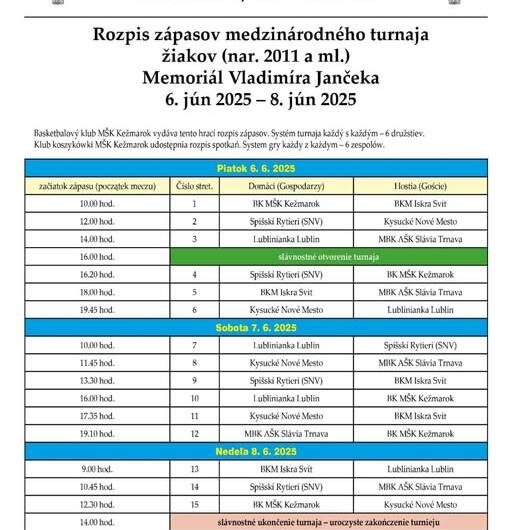 Po Mazowsze Cup 2025 (Warszawa) oraz Memoriale im. Andrzeja Kasprzaka (Lublin) podopieczni trenera Michała Wiśniewskiego zagrają w ten weekend na Słowacji. Trzeci sezon z rzędu reprezentacja naszego klubu wystąpi w międzynarodowym Memoriale im. Vladimira Janceka. Podrzucamy harmonogram meczów. Powodzenia Panowie!