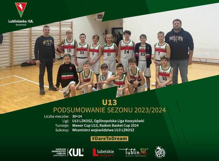 Pierwszy zespół, prowadzony przez trenerów Adriana Szczotkę i Michała Wiśniewskiego, zagrał w całym sezonie 30 spotkań. Zdobył wicemistrzostwo województwa w lidze U13 LZKOSZ, a następnie walczył w rozgrywkach strefowych. Oprócz tego wziął również udział w turniejach Ogólnopolskiej Ligi Koszykówki w Piasecznie, Wawer Cup 2023 w Warszawie (przeciwnicy: MKS Grójec, Pogoń Basket Szczecin, MUKS 1811 Tarnów, KS AS Mrągowo, PGE Akademia Koszykówki Młode Żubry Białystok) oraz Radom Basket Cup 2024 (mecze z Tarnowia Tarnowo Podgórne, SCC Ploskyriv, Legia Warszawa, Akademia Młodych Dzików Warszawa, Basket Team Suchy Las).