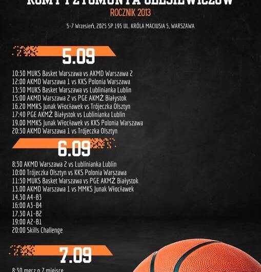 – U13 (roczniki 2013 i 2014) – 5/6/7 września, Memoriał Romy i Zygmunta Olesiewiczów, hala sportowa, ul. Króla Maciusia 5, Warszawa. Rozkład jazdy na grafice turniejowej.
